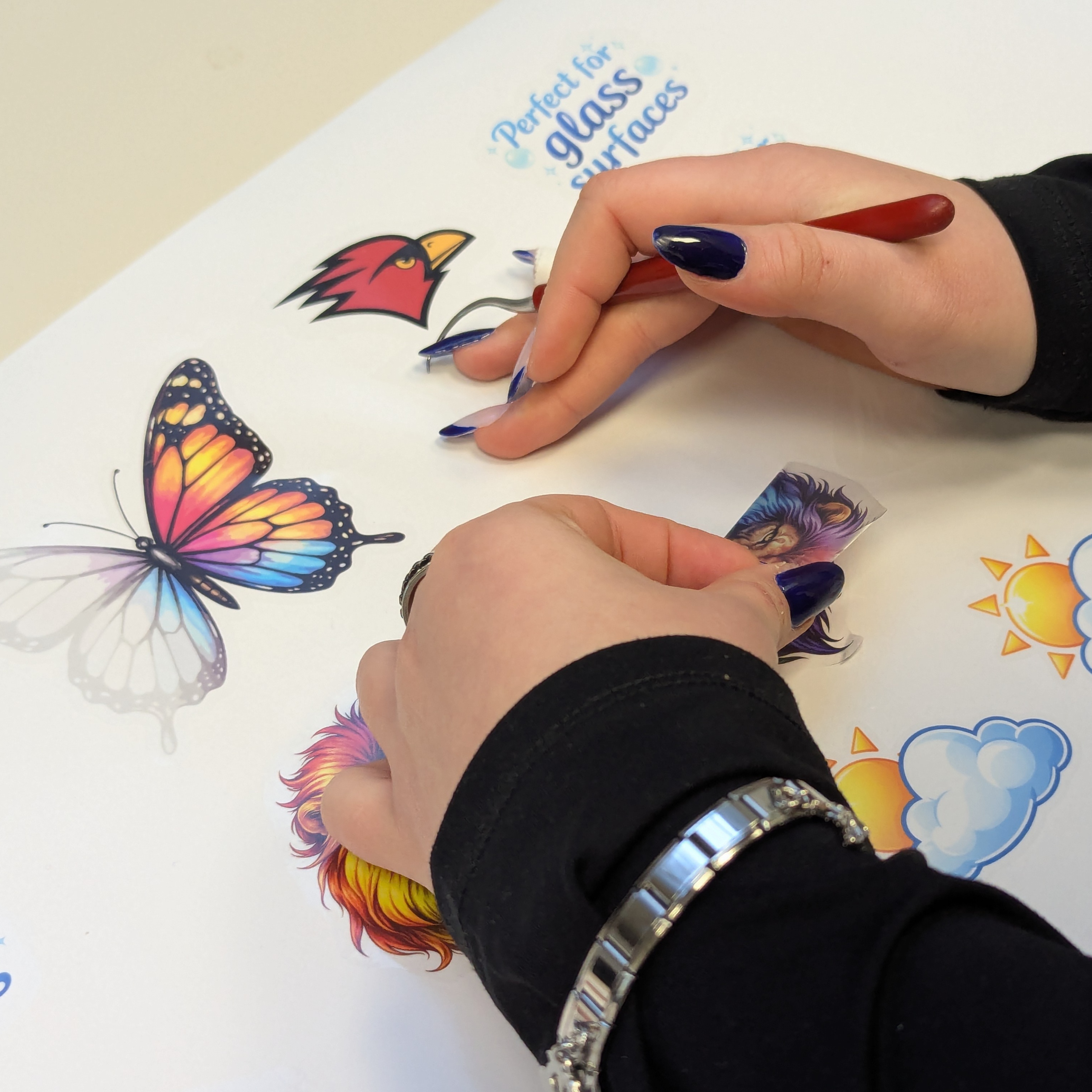 ✔ Aplikacja na powierzchniach: Ze względu na bardzo cienką folię, zalecamy aplikację na jasne powierzchnie lub przezroczyste szyby. W przypadku bardzo ciemnego tła, może ono lekko przebijać przez grafikę, co warto uwzględnić przy projekcie.